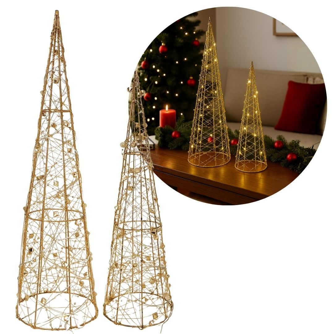 O kit inclui 2 árvores iluminadas em tamanhos diferentes (50cm e 40cm), confeccionadas em estrutura metálica aramada no formato de cone e decoradas com miçangas douradas e mini bolinhas cristal, que refletem a luz e criam um efeito luminoso sofisticado. Cada árvore possui fio LED branco quente, alimentado por pilhas, garantindo iluminação suave e acolhedora — perfeita para decorar salas, mesas, aparadores ou vitrines.