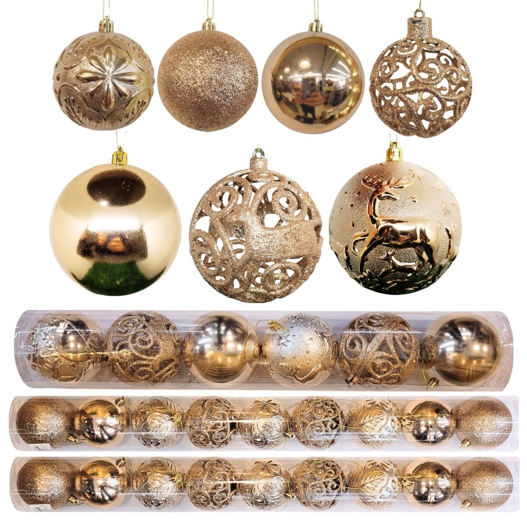 -18 Unidades Bola Natal Mista (Lisa, Glitter Vazado Folhagens e Auto-relevo luxo Rena e Pinheiros) 8cm Champanhe