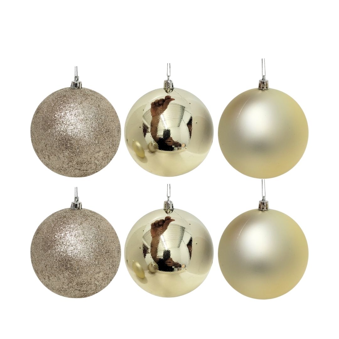 Deixe sua árvore ainda mais elegante com o Conjunto de Bolas de Natal Champanhe Prime Texturas Mistas. Cada bola possui acabamento diferenciado — glitter, brilho espelhado tradicional e fosco, garantindo um efeito visual sofisticado e harmonioso na decoração.