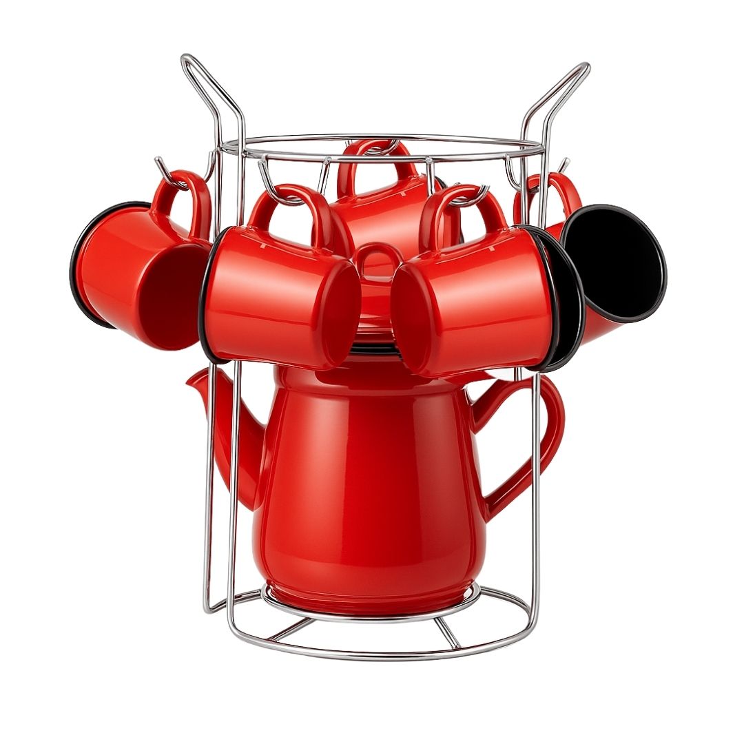 Conjunto com Suporte Cromado + 01 Bule Esmaltado 1000ml + 6 Mini Canecas Esmaltadas Vermelhas 110ml – 8 Peças