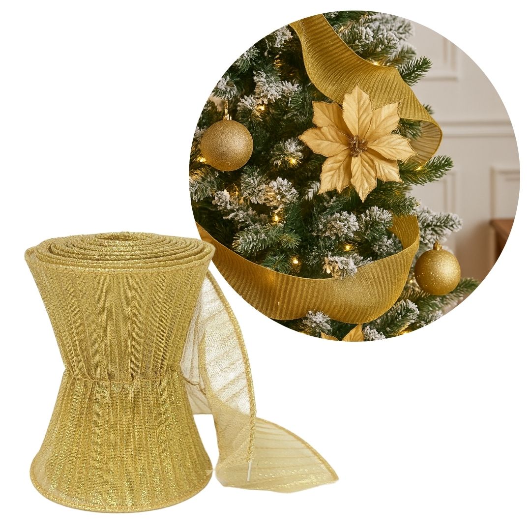 O acabamento plissado em tom dourado traz um brilho refinado e elegante, perfeito para quem deseja destacar sua decoração com um toque festivo e luxuoso. Sua lateral aramada flexível garante praticidade no manuseio, permitindo modelar e fixar facilmente, mantendo a fita no formato desejado.