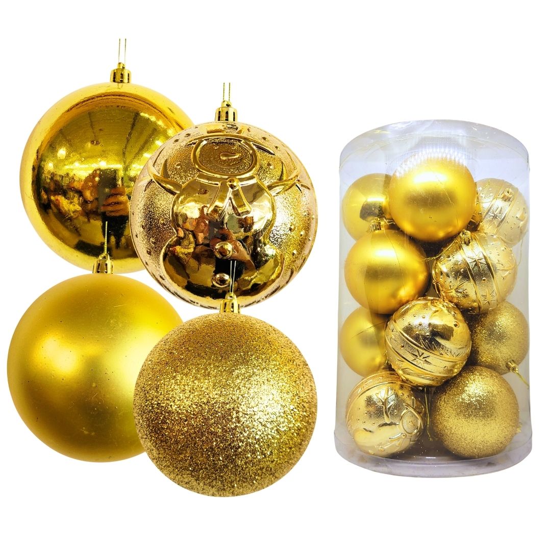 -16 Unidades Bola Natal Mista (Lisa, Glitter, Brilho e Boneco de Neve Auto-relevo luxo) 10cm Dourado