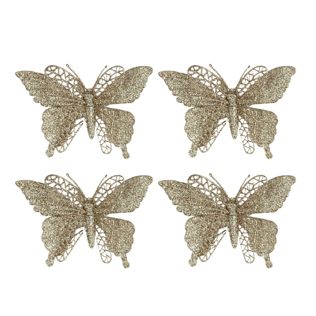 04 Borboletas Acetinadas Glitter Champanhe 12x18cm com presilha