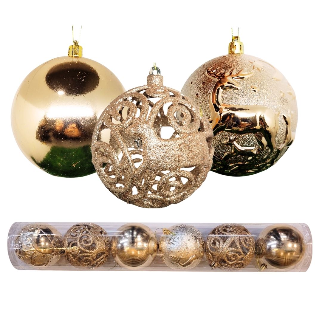 -06 Unidades Bola Natal Mista (Lisa, Glitter Vazado Rena e Auto-relevo luxo Rena e Pinheiros) 10cm Champanhe