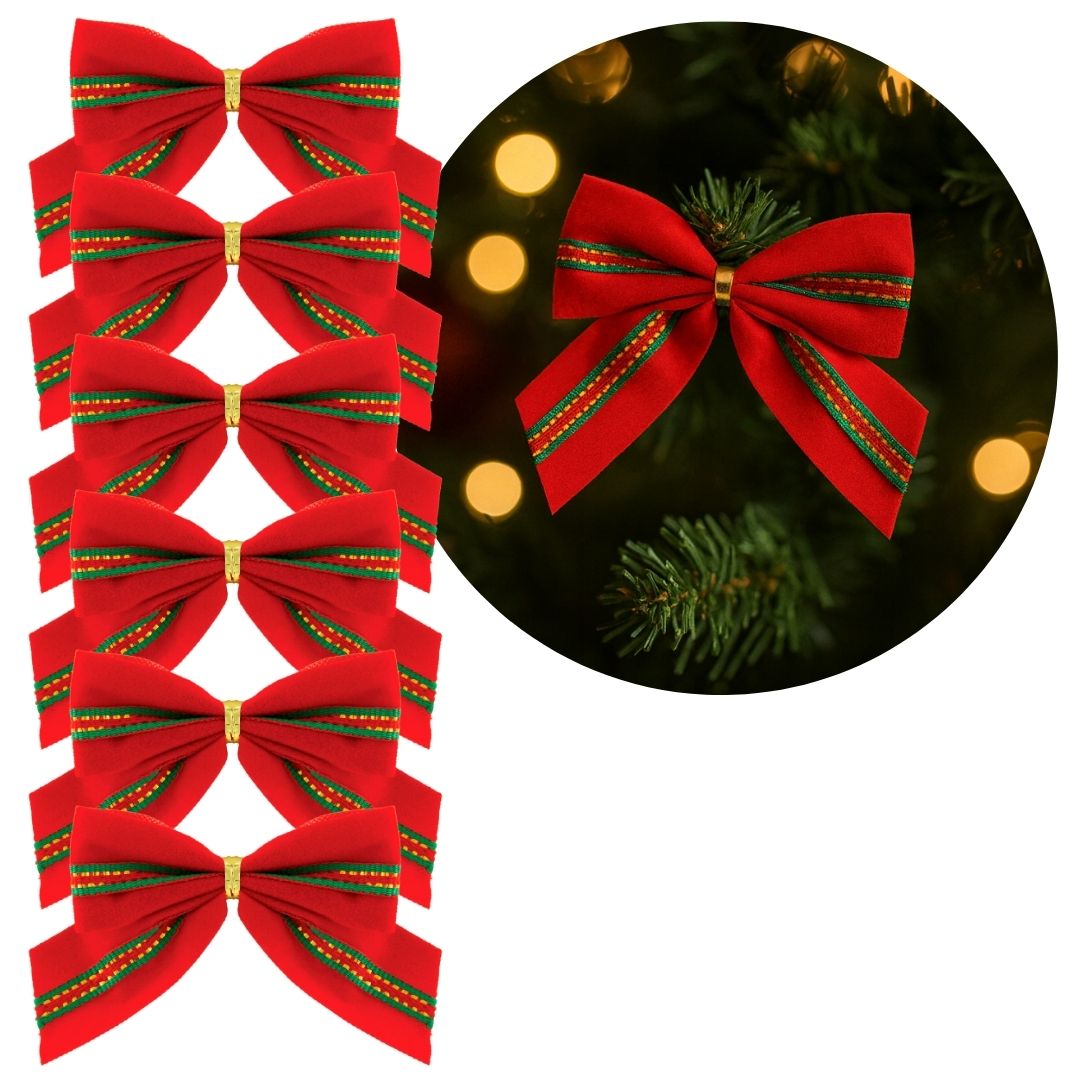 Deixe sua árvore de Natal ainda mais especial com este jogo de mini laços decorativos em veludo vermelho e verde com acabamento dourado estilo galão. Cada laço já vem pronto para uso e conta com presilha para fixação, garantindo praticidade e firmeza na decoração.