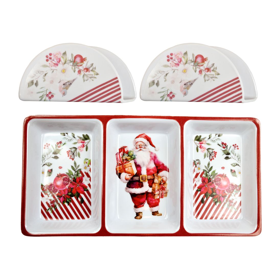 Leve o encanto do Natal à sua mesa com este Jogo Petisqueira Retangular Natalina em Melamina e Porta Guardanapo, com estampa exclusiva de Papai Noel e flores festivas. O design conta com 3 repartições práticas, ideais para servir petiscos, castanhas, frutas secas, doces e acompanhamentos durante as festas de fim de ano.