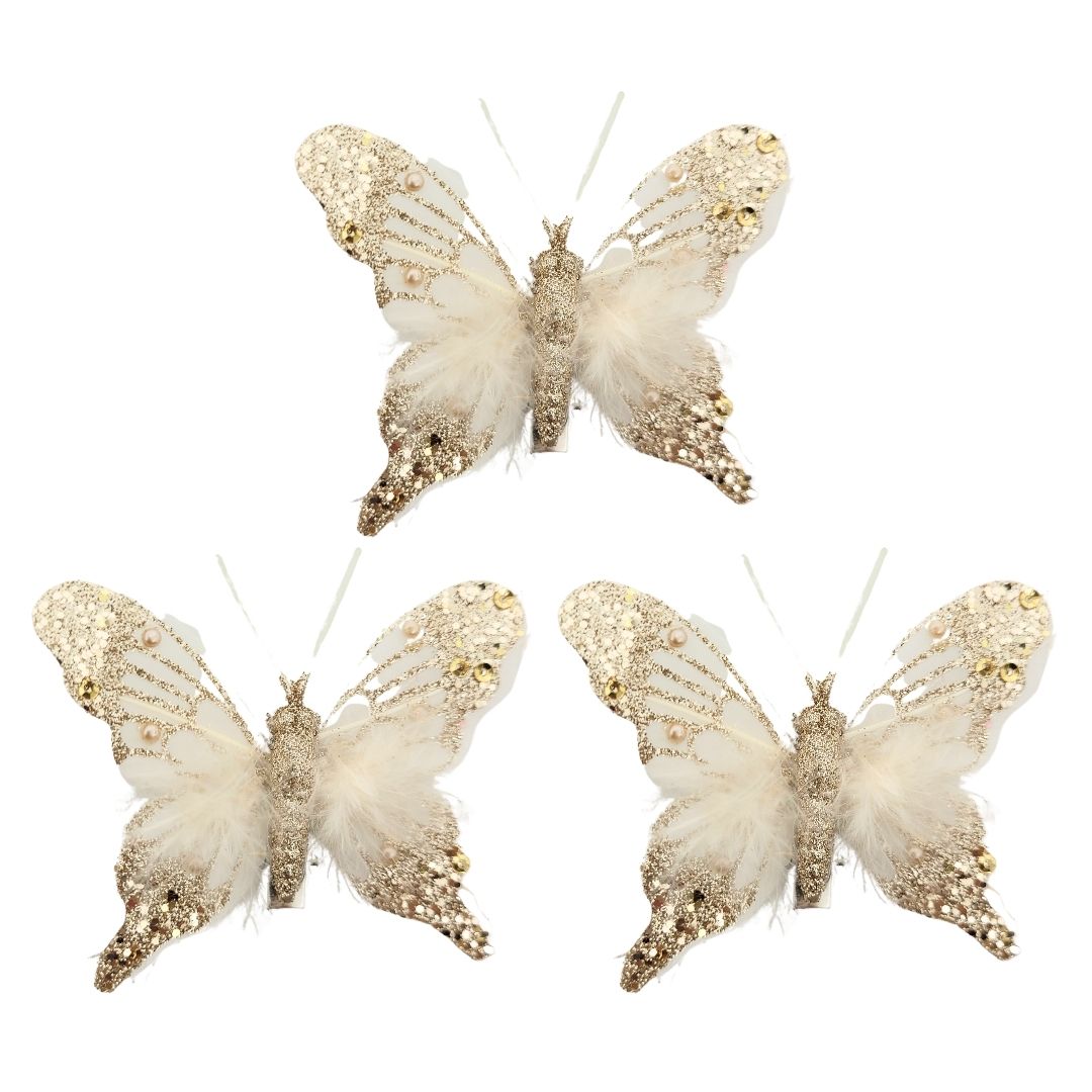 -03 unidades Borboleta Decorada Glitter Champanhe Plumas Luxo 8cm - Magizi