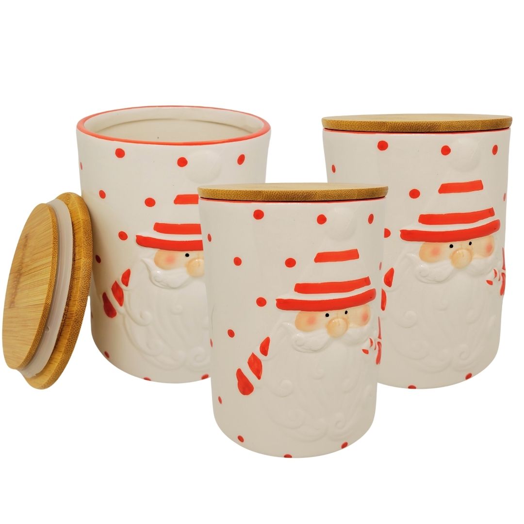 Kit 3 Potiche Papai Noel Cerâmica Tampa Hermética Bambu 1L
