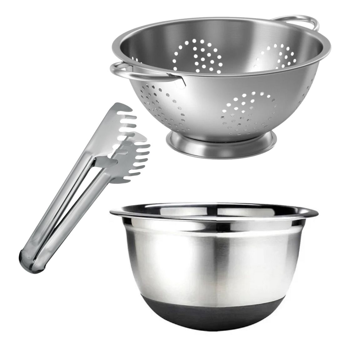 Kit Escorredor de Massa, Bowl Inox Antiderrapante e Pegador