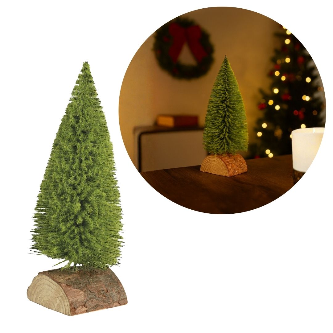01 Mini Pinheiro de Mesa 18 cm com base em tronco de madeira rústico