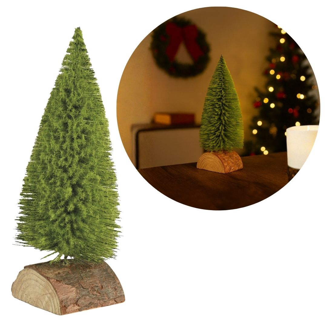 01 Mini Pinheiro de Mesa 24 cm com base em tronco de madeira rústico