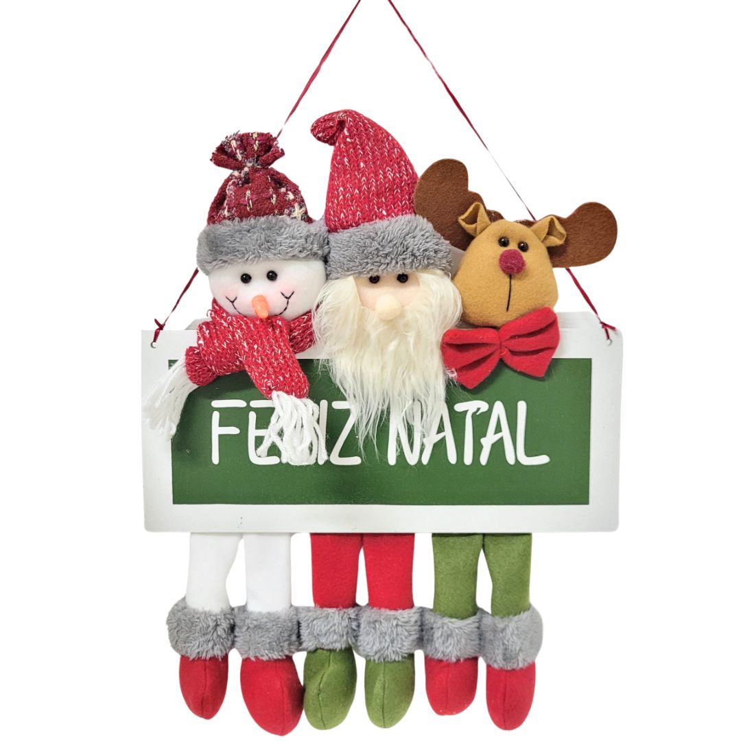 -01 unidade Placa Feliz Natal Madeira Papai Noel, Boneco de Neve e Rena Pelúcia Premium 34cm - Master Christmas