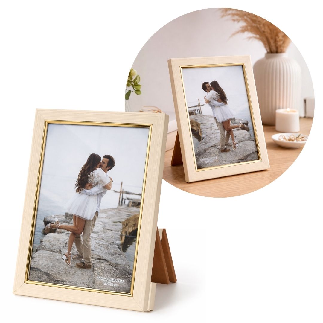 O Porta Retrato 15x21 em madeira bege fosca com detalhes dourados é a escolha perfeita para quem busca sofisticação com um toque clássico e elegante. Seu design com borda dourada e friso interno em acabamento ouro valoriza ainda mais suas fotos, trazendo destaque e requinte para qualquer ambiente.