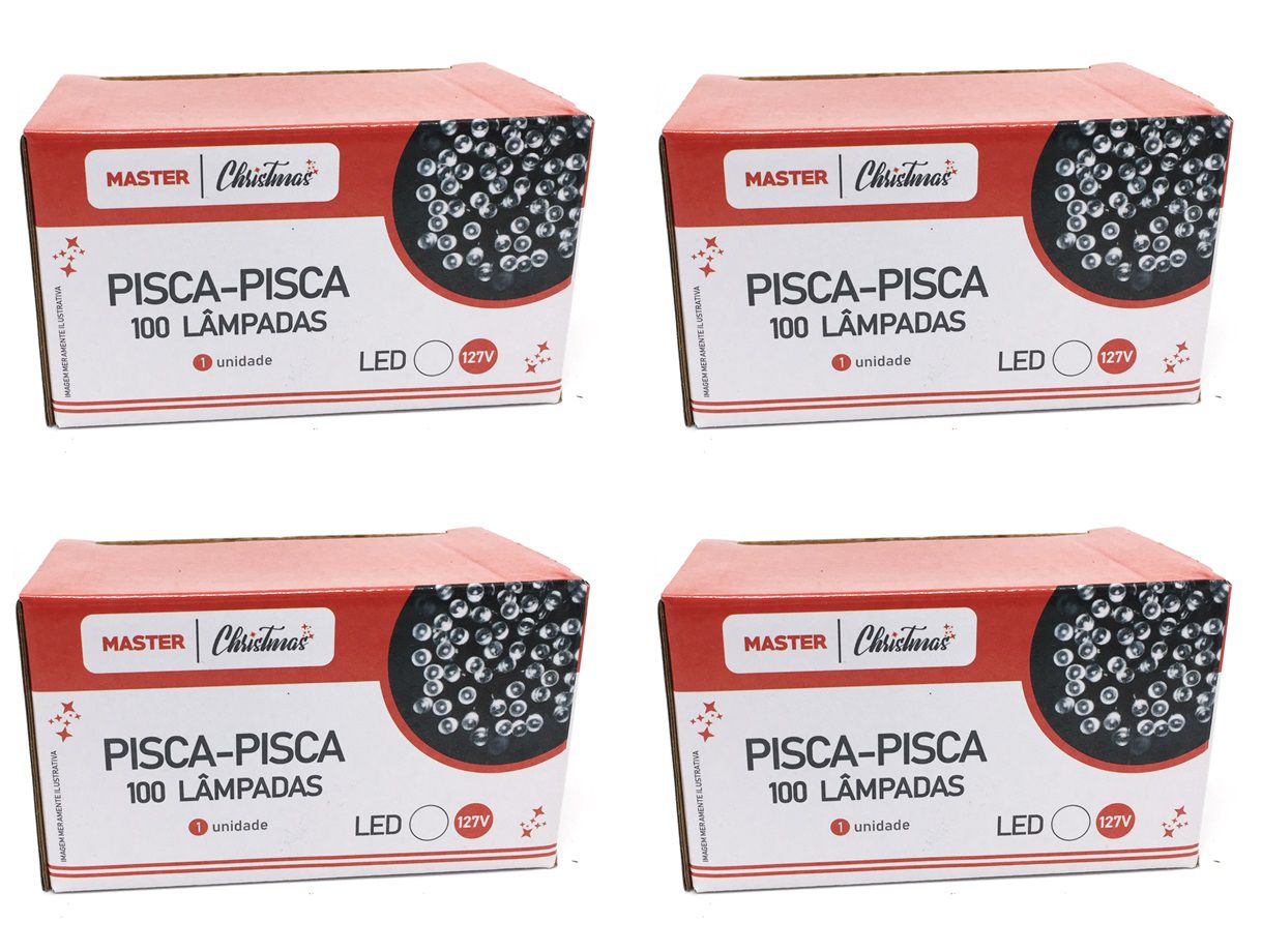 Conteúdo da embalagem: 04 unidades Pisca Pisca 100 Lâmpadas LED Branco Quente 8 Funções 127V - Master Christmas