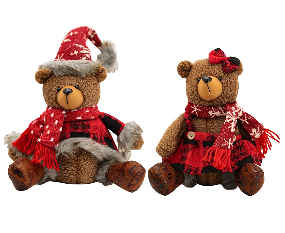 -01 Mamãe Ursa Natal Pelúcia Sentado 23cm Cachecol Tricô e Casaco Xadrez - Magizi