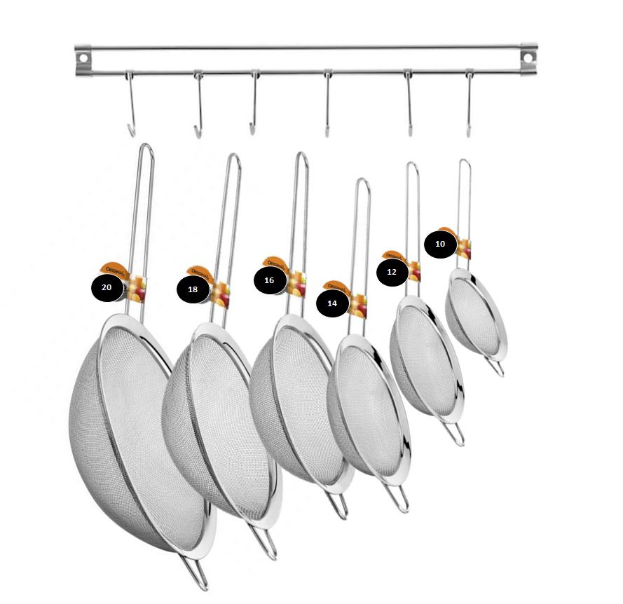Este Kit Exclusivo possui 6 tamanhos das peneiras de 10 a 20cm e ainda um suporte em aço inox com 6 ganchos para parede.