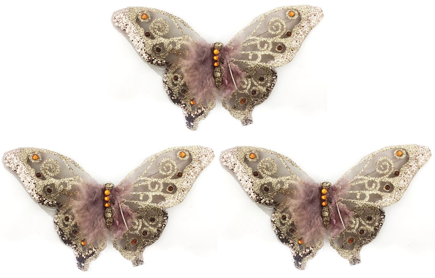 Kit com 3 Borboletas Plumas e Pedras Bronze para decoração árvore de natal.