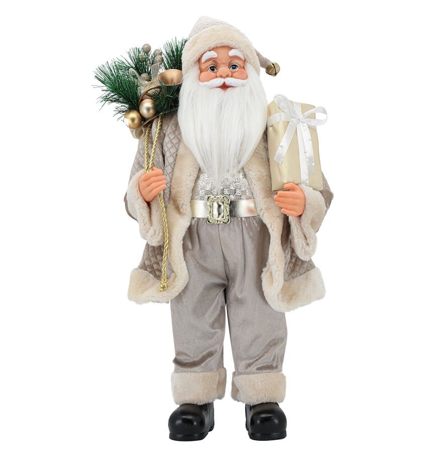 Por isso a trazemos até você um enfeite natalino, com as figuras do querido papai noel, este modelo Luxo tamanho Grande com 60cm de altura, decorado com casaco Champagne Luxo ainda possui enfeites de pinhas e berries, bolas douradas além de um lindo saco de presentes decorado!