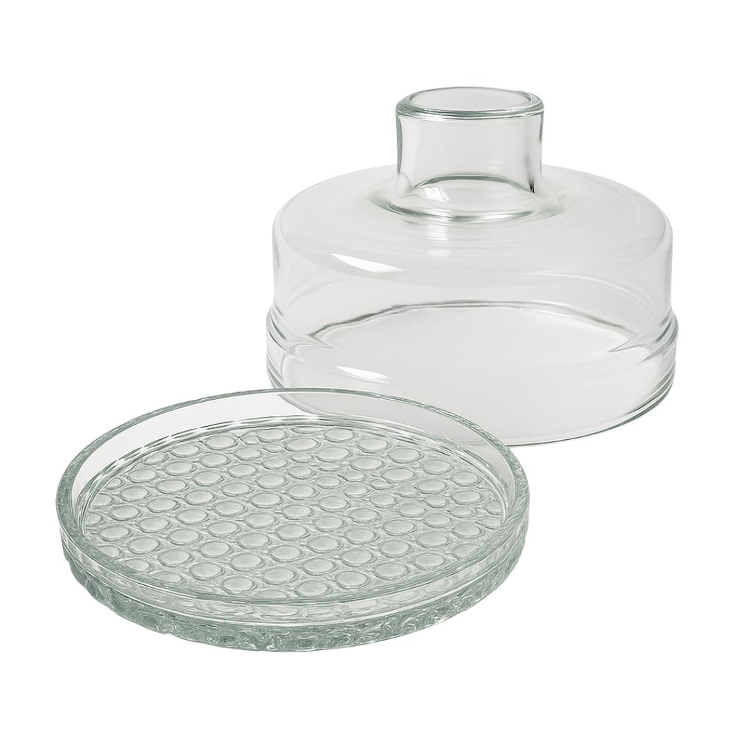 O modelo acompanha uma tampa em vidro transparente com puxador, que protege os queijos contra odores externos, insetos e ressecamento, mantendo a textura e o sabor por mais tempo. Além disso, o design elevado com base confere requinte e facilita o manuseio na hora de servir.